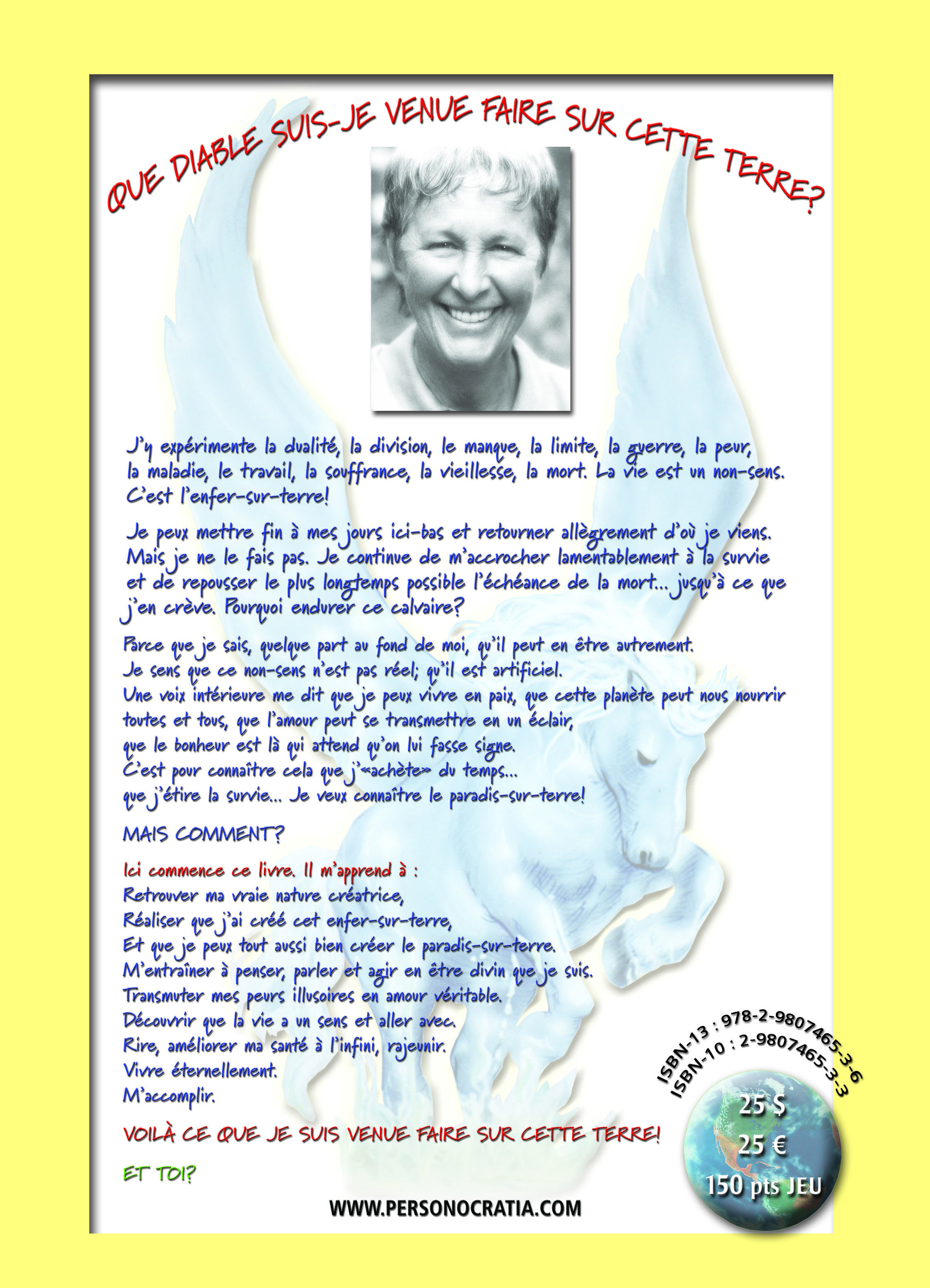 Ce livre y répond : retrouver ma nature créatrice; apprendre à penser, parler et agir en être divin que je suis; transformer mes peurs en amour; découvrir que la vie a un sens; m’accomplir; trouver la paix et la joie; rire; connaître jeunesse, santé et immortalité. VOILÀ CE QUE JE SUIS VENUE FAIRE SUR TERRE! ET VOUS?